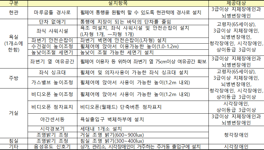 장애인의 편의증진을 위해 최초 입주자 본인 또는 부양가족 중 1명 이상이 제공대상에 해당하는 경우 신청자에 한하여 대상에 따라 아래 편의시설을 무료로 설치하여 드립니다.