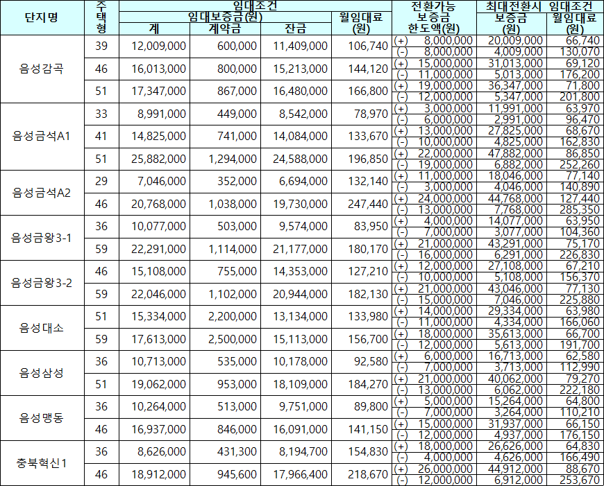 | 음성맹동 | 충북 음성군 맹동면 대동로 26 (쌍정리 131-1) 음성맹동휴먼시아아파트 | 4개동 261호 | 2011. 01. |