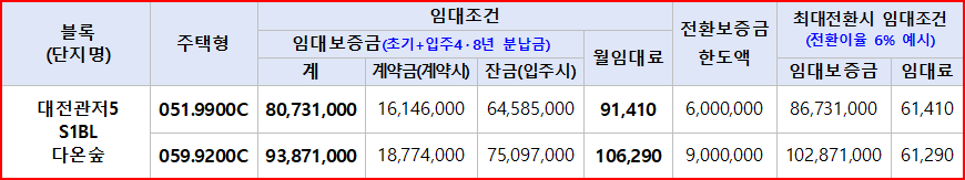 ※ 전환보증금은 계약자의 선택사항으로 임대보증금 잔금 납부 이후 임대기간동안 100만원 단위로만 납부가 가능하며 전환보증금 한도액은 입주자모집공고일 현재 기준이며, 계약시기 및 전환보증금 납부시기에 따라 변경될 수 있습니다.