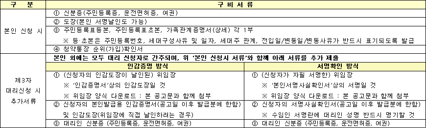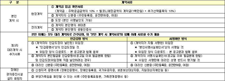 아래의 계약서류는 입주자모집공고일 이후 발급분에 한하며, 계약서류 중 1건이라도 미비 시에는 계약이 불가합니다.