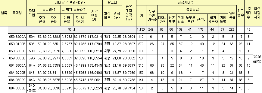 공급대상공공분양주택 1,130세대 중 881세대 (전용면적 59㎡ 377세대, 84㎡ 504세대)