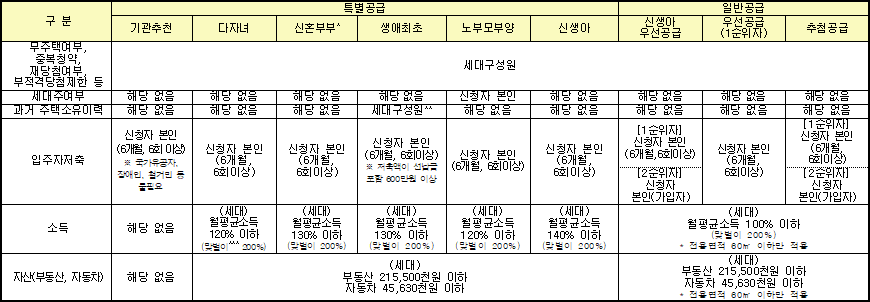 자산 소득기준, 입주자격 조건, 전매제한, 거주의무기간 등