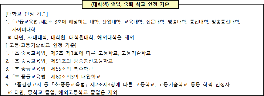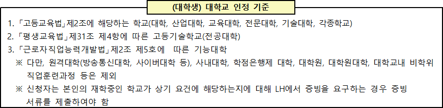 ④-② 대학생 : 대학 또는 「초, 중, 고등교육법」 제2조 제3항에 따른 고등ㆍ고등기술학교를 졸업하였거나 중퇴한 후 2년 이내인 사람 (졸업유예자 포함)으로서 직장에 재직 중이지 않은 사람 (입주신청일 현재 해당연도 입학 및 복학 예정자 포함)