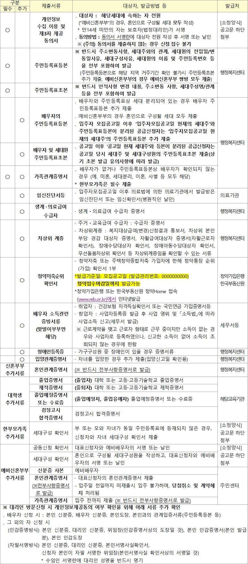 서류제출대상자로 선정되신 분은 등기우편으로 서류제출 기한 내 해당 서류를 제출하여야 하며, 미제출 시 예비입주자 선정에서 제외됩니다.
