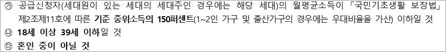 | ※ 배우자가 국내 거주하지 않는 재외국민이거나 외국인 등록을 하지 않은 외국인 (국내거소신고를 하지 않은 외국국적동포 포함)인 경우 그와 혼인관계에 있는 국민은 공급 신청이 불가능합니다. |