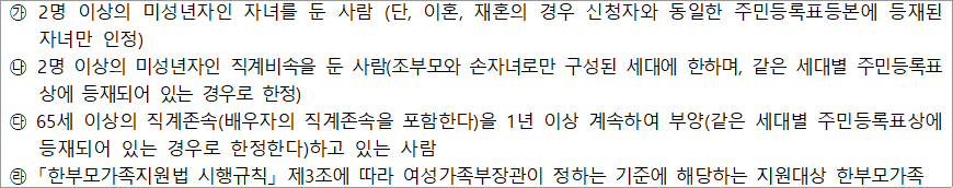 ③ 다자녀가구 등 : 미성년자녀 2명 이상의 가구 (조손가정 포함), 65세 이상 직계존속 부양자, 지원대상 한부모가족