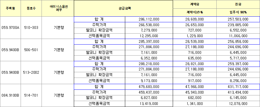 ③ 상기 주택가격에는 발코니 확장비용 및 취득세 등의 제세공과금이 포함되어 있지 않으며, 각 주택형별 지하주차장에 대한 금액이 포함되어 있습니다.